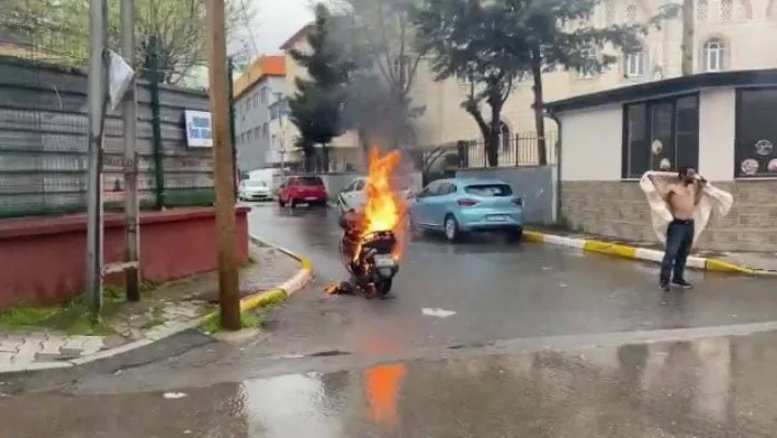 Durumun bildirilmesi üzerine olay yerine itfaiye ve polis ekipleri sevk edildi. İtfaiye ekipleri yangına müdahale ederken motosiklet sahibinin itfaiye ekiplerine engel olmaya çalıştığı anlar saniye saniye kaydedildi.