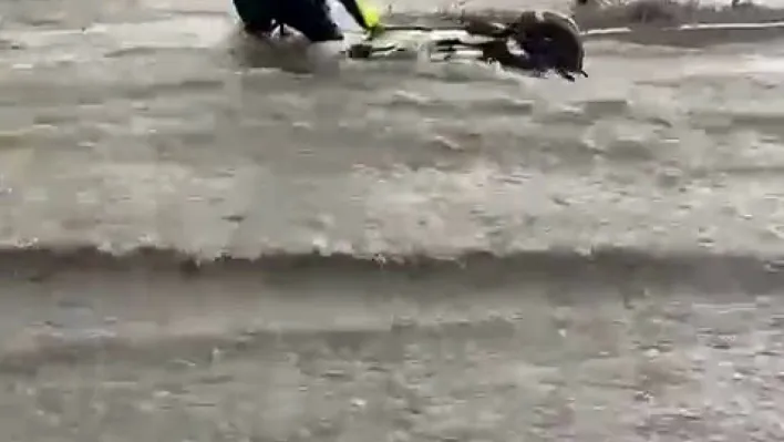 Küçükçekmece İkitelli'de aşırı yağış nedeniyle göle dönen caddede bir motosikletli sürüklendiği anlar kameraya böyle yansıdı.