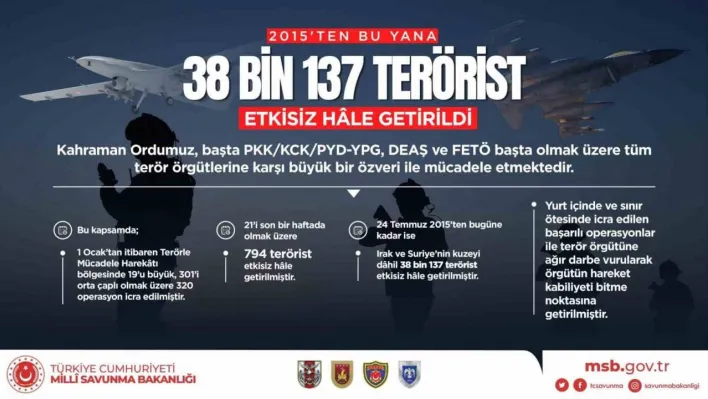 Milli Savunma Bakanlığı, 24 Temmuz 2015'ten bugüne kadar Irak ve Suriye'nin kuzeyi dahil 38 bin 137 teröristin etkisiz hale getirildiğini duyurdu. Bakanlık ayrıca 1 Ocaktan bu yana Terörle Mücadele Harektı bölgesinde 19'u büyük, 301'i orta çaplı olmak üzere toplam 320 operasyon icra edilerek 21'i son bir haftada olmak üzere 794 teröristin etkisiz hale getirildiğini açıkladı.