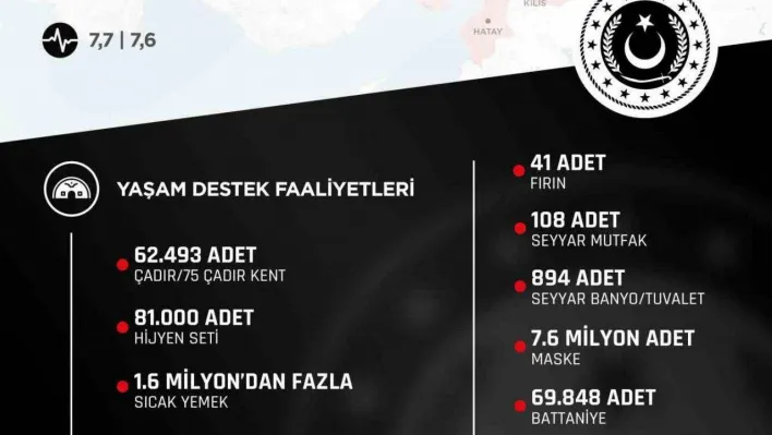 Milli Savunma Bakanlığı (MSB), merkez üssü Kahramanmaraş’ın Pazarcık ve Elbistan ilçeleri olan ve 11 ili etkileyen "asrın felaketinin" hemen ardından sahada icra ettiği faaliyetlerine aralıksız devam ediyor. MSB yaşam destek faaliyetleri kapsamında 75 çadır kentte 62 bin 493 çadır, 81 bin hijyen seti, 1,6 milyondan fazla sıcak yemek, 4,6 milyondan fazla kumanya, 3 milyon 130 bin ekmek, 7,6 milyon adet maske, 69 bin 848 adet battaniye ve 70 bin 439 adet giysi ihtiyacı temin edildi.