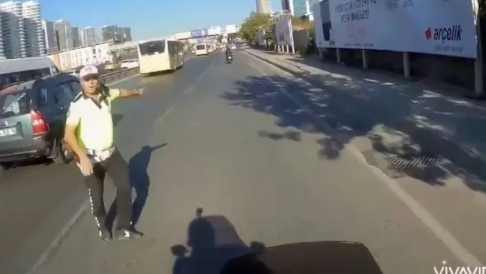 Muhtar olduğunu iddia eden şahıs motosiklet sürücüsüyle tartıştı. Motosiklet sürücüsü durumu trafik polisine bildirdi. Yoldan geçen başka bir motosiklet sürücüsünü durduran trafik polisi, muhtarı takip ederek yakaladı. O anlar kask kamerasına yansıdı.