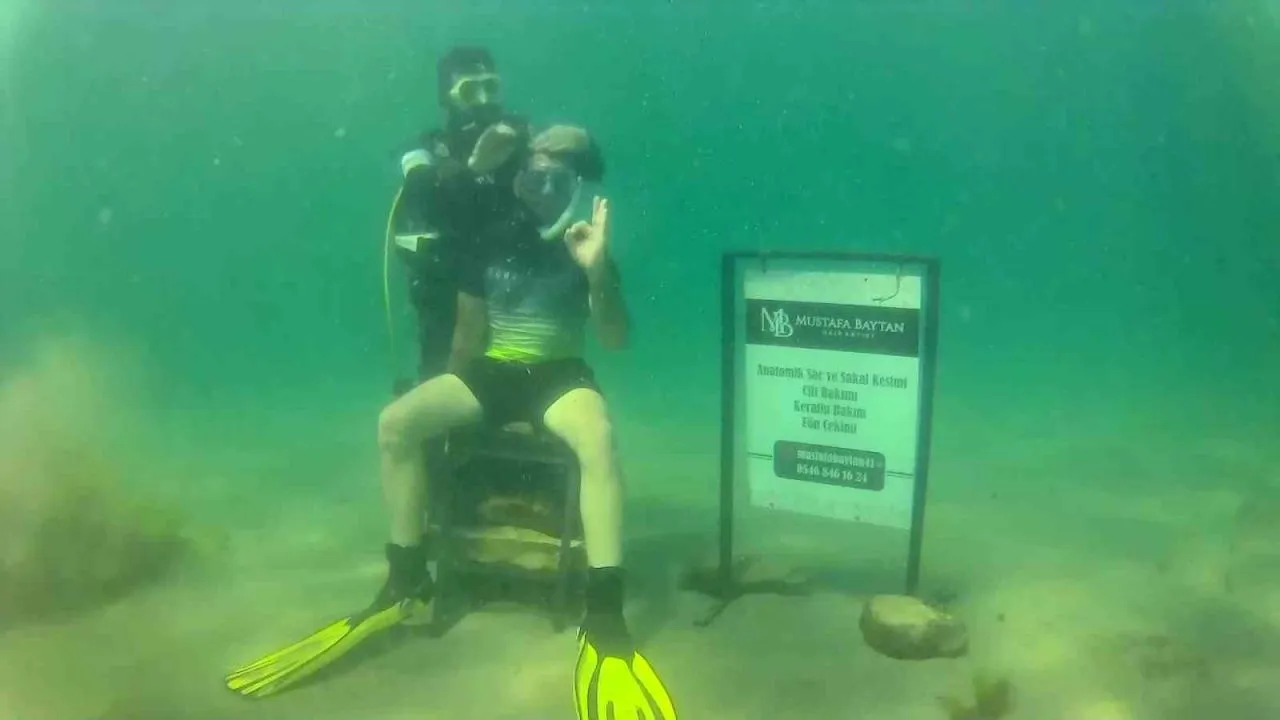 Kocaeli’de 10 yıl ara verdiği berberliğe geri dönen Mustafa Baytan, mesleğinin köreldiğini söyleyenlere inat, deniz altında saç keserek adından söz ettirdi. Sosyal medyada paylaştığı videosu bir günde 1,5 milyon kez izlenen Baytan’ın yeni hedefi ise havada tıraş yapmak.