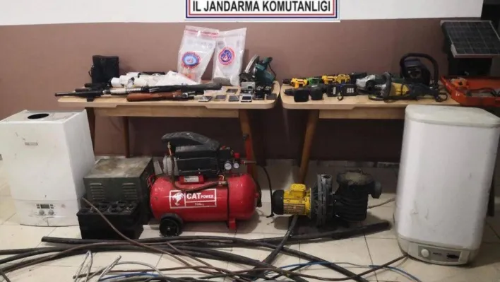 Edinilen bilgiye göre, Geyve ilçesi Hırka Mahallesi’nde Ş.S. isimli vatandaşın evinden birçok eşya çalındı. Durumun haber verilmesi üzerine jandarma ekipleri konuya ilişkin inceleme başlattı. Çalışmalar neticesinde Çeltikler Mahallesi’nde B.Y. isimli şüphelinin ev ve eklentilerine JASAT ekipleri ile birlikte baskın düzenlendi. Yapılan aramalarda; çeşitli marka ve modellerde 7 adet cep telefonu, 2 adet içerisinde 243,38 gram uyuşturucu olduğu değerlendirilen madde bulunan kavanoz, 2 adet kurusıkı tabanca, 1 adet markası ve seri numarası belli olmayan demir aksamlı tabanca, 6 adet tabanca şarjörü, 1 adet av tüfeği, hava kompresörü, dürbün, telsiz telefon, 9 adet matkap, 2 adet spiral taşlama, dekupaj testere, ağaç kesim motoru, 3 adet fotoğraf makinesi, 9 adet güvenlik kamerası, akü şarj cihazı ve 22 adet elektrik kablosu ele geçirildi.