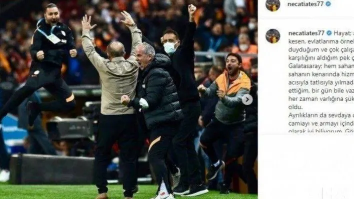 Galatasaray'da Teknik Direktör Fatih Terim'in yardımcı antrenörlüğünü yapan Necati Ateş, sarı-kırmızılılara yaptığı veda paylaşımında, 'Ayrılıkların da sevdaya dahil olduğunu bu camiayı ve armayı, içinde yaşamış biri olarak iyi biliyorum. Gönüllerimizin bir olduğu bu süreçte bana inanarak görev veren hocamız Fatih Terim başta olmak üzere herkese teşekkür ederim' dedi.