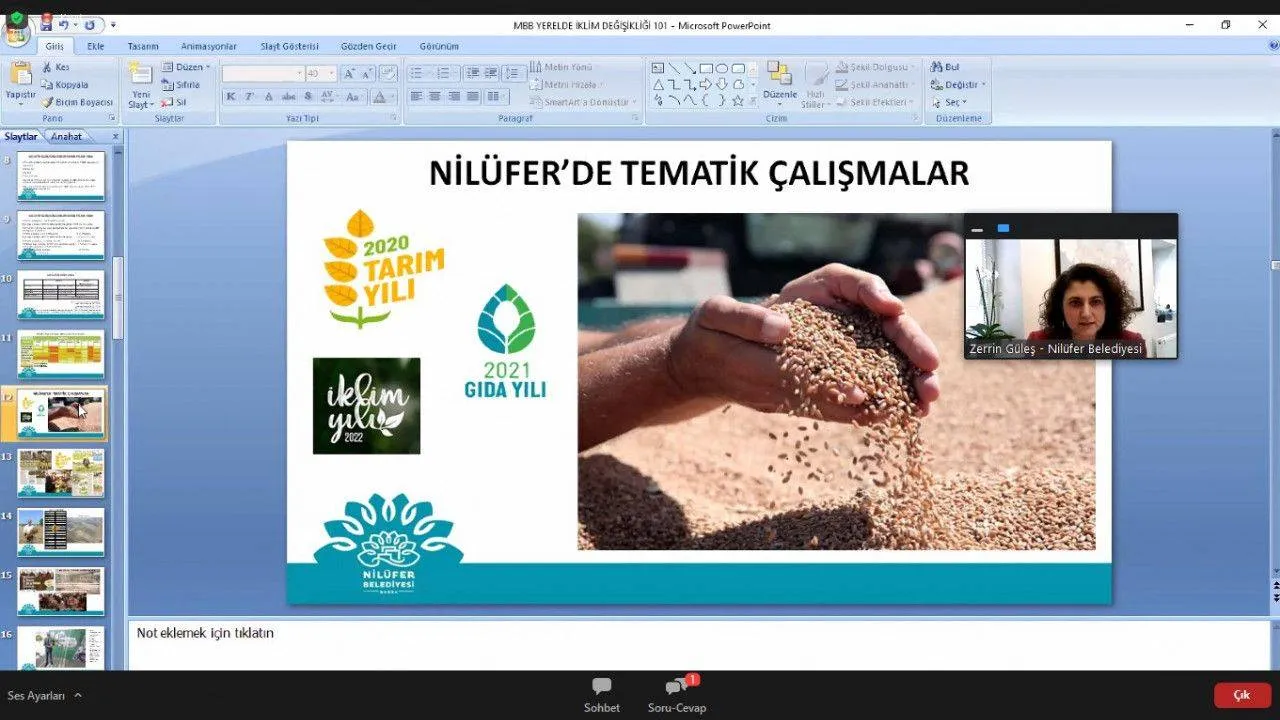 Marmara Belediyeler Birliği’nin düzenlediği ’Yerelde İklim Değişikliği 101’ başlıklı eğitim programına katılan Nilüfer Belediyesi İklim Değişikliği ve Sıfır Atık Müdürü Zerrin Güleş, Nilüfer Belediyesi’nin bu konudaki deneyimlerini paylaştı.