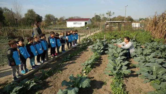 Nilüfer Belediyesi'nin Ürünlü Mahallesi'nde ekolojik tarım koşullarında üretim yaptığı Kent Bostanları, anaokulu öğrencilerini ağırladı.