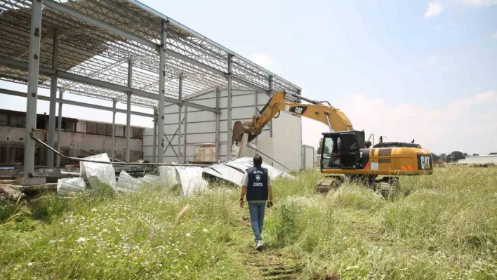 Gerekli tedbirleri alan ekipler, Alaaddinbey Mahallesi’nde inşa edilmiş çelik konstrüksiyon yapıyı yıktı. İş makinesinin kullanıldığı yıkım çalışmasında tarla vasfındaki alana kurulmuş 850 metrekarelik depo yıkıldı.