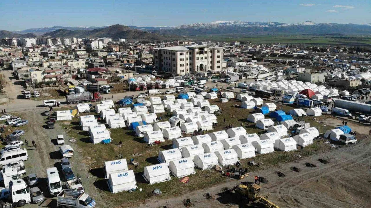 Merkez üssü Kahramanmaraş'ın Pazarcık ve Elbistan ilçelerinde meydana gelen 7,7 ve 7,6 büyüklüğündeki depremlerle adeta enkaz alanına dönen Gaziantep'in Nurdağı ilçesinde bir yandan arama kurtarma çalışmaları sürerken vatandaşların barınması için de çadırkent kuruldu. Çadırkent dron ile havadan görüntülendi.