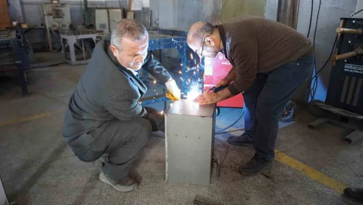 Meslek lisesinin atölyesinde yapılan çalışmalarda hem çadır içinde kullanılabilecek gibi hem de dış mekanda yakılabilecek gibi olmak üzere 2 çeşit soba üretiliyor.