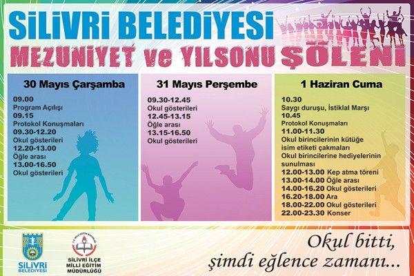 Silivri Belediyesi, Silivri İlçe Milli Eğitim Müdürlüğü ile birlikte 30-31 Mayıs ve 01 Haziran tarihlerinde gerçekleşecek olan Mezuniyet ve Yılsonu Şöleni organize etti. İlçedeki tüm eğitim kurumlarının dahil olduğu program kapsamında, öğrenciler yıl boyunca ürettikleri el emeği ürünlerini sergileyecek, dans gösterileri gerçekleştirilecek. Silivri Sahili Kordon Boyunda kurulan stantlarda resim, el işi, takı, bilim teknik projesi gibi birçok ürün sergileyecek olan ilköğretim ve liseli öğrenciler, hünerlerini gösterme imkânı bulacak.