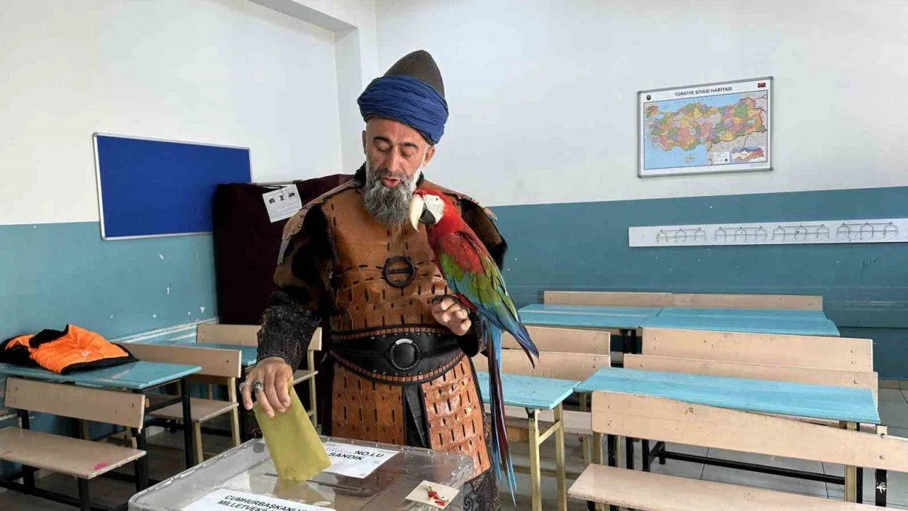 Esenyurt’ta Nazım Cihan isimli vatandaş, Osmanlı dönemi kıyafetini giyip papağanıyla birlikte oy kullanmaya geldi. Papağan vatandaşların ve sandık görevlilerinin ilgi odağı oldu.
