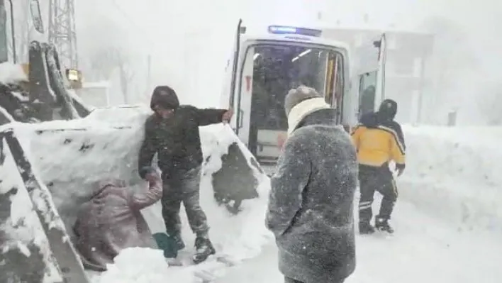 Ordu'da hastalanan kadın, karla kaplı yolda kepçe ile ambulansa taşındı