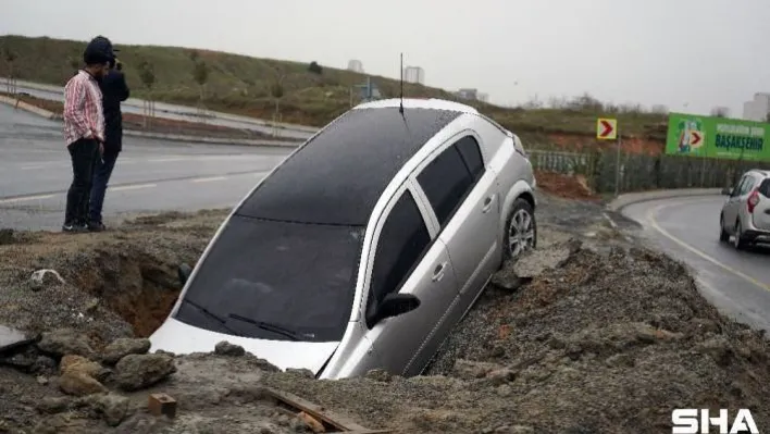 Başakşehir'de, seyir halindeki otomobil yol çalışmasının yapıldığı çukura düştü. Faciadan dönülen kazada, kimse yaralanmazken otomobilde maddi hasar meydana geldi.