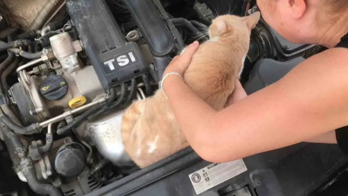 Daha sonra otomobilin başına gelen vatandaşın araç kaputunu açmasıyla “Tarçın” isimli kedi sıkıştığı yerden çıkarıldı.