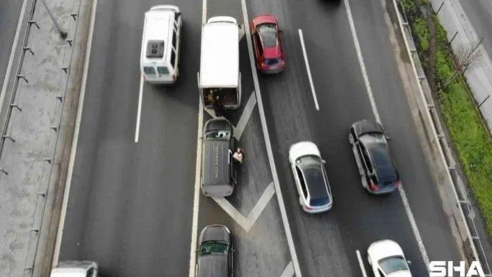 Basın Ekspres yolu üzerinde bir firmaya ait araçların kargo transferi kameraya yansıdı. 4 şeritli akan trafikte kamyonetin arkasına sırayla yanaşan araçlar transferi gerçekleştirip yoluna devam etti. Yaşananlar drone ile görüntülendi.