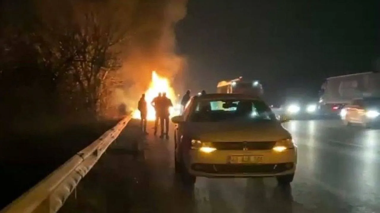 Anadolu Otoyolu Sakarya geçişinde bir araçta yangın çıktı. Alevlere teslim olan araçtaki kişilerin yara almadan atlattığı olayda, araç içerisinde bulunan 2 koyun ve 2 keçi de son anda kurtarıldı. Hayvanların kurtarılarak hafif ticari araca yüklendiği anlar cep telefonuyla kaydedildi.