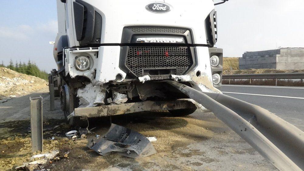 Kaza, TEM Otoyolu Kınalı mevkiinde meydana geldi. V.Ç yönetimindeki tır sürücünün direksiyon hakimiyetini kaybetmesi sonucu bariyerlere çarparak sürüklendi. Kazanın şiddetiyle yaklaşık 100 metre sürüklenen tıra bariyerler ok gibi saplandı. Kazada araç sürücüsü yara almadan kurtulurken tır itfaiye ekiplerinin çalışması sonucu bariyerlerden kurtarıldı. Kaza sebebiyle araç trafiği bir süre tek şeritten sağlandı.