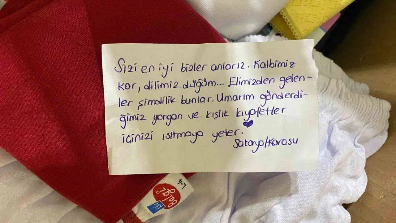 Kahramanmaraş merkezli meydana gelen iki büyük deprem için tüm ülke tek yürek oldu. Sakarya'da toplanan yardım kolilerinin içerisinden çıkan ve miniklerin kaleme aldığı notlar ise duygulandırdı.