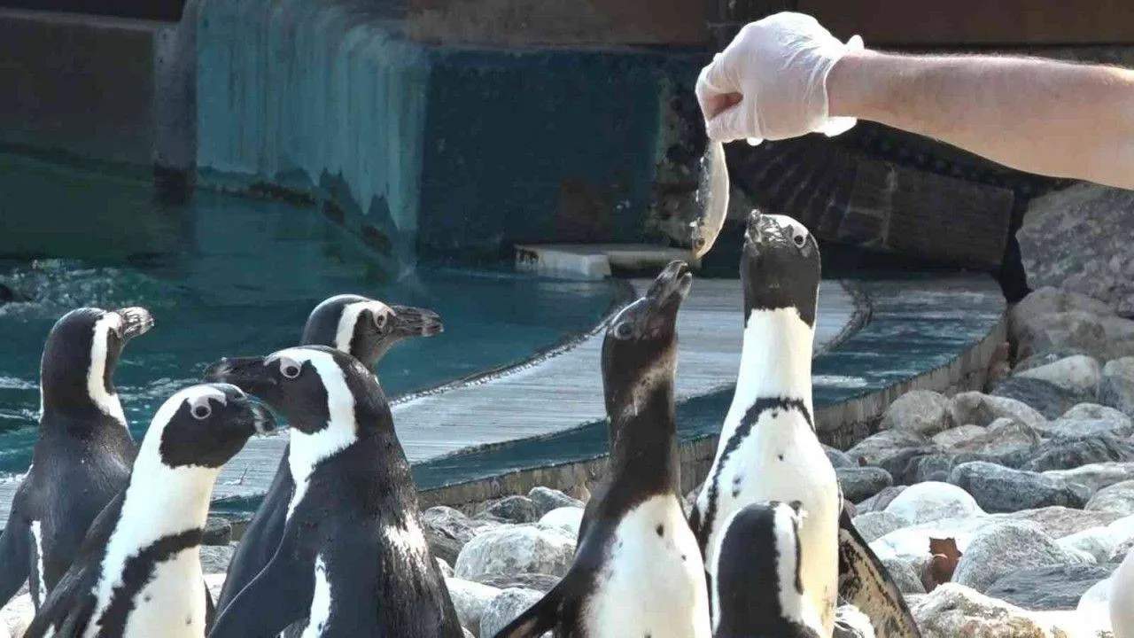 Bursa Hayvanat Bahçesi'nde görevliler tarafından beslenen penguenler, balıkları afiyetle midelerine indirdi. Flamingoların beslenmesi ise renkli görüntülere sahne oldu.