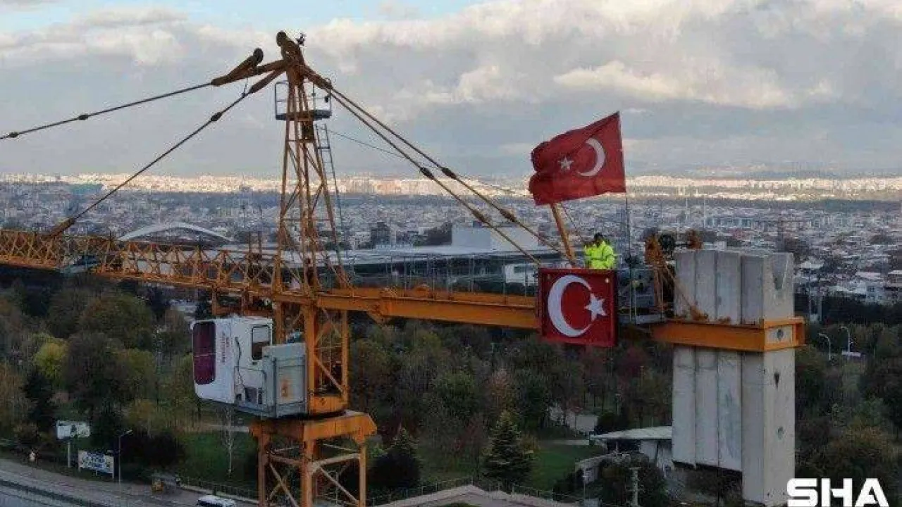 Türkiye’nin en büyük meydanlarından biri olan Osmangazi Meydanı inşaatı için kurulan 80 metrelik vinçlerde çalışan 2 operatör 09.05’te vinçlerin en üst noktasına çıkıp Atatürk’e saygı duruşunda bulundu.