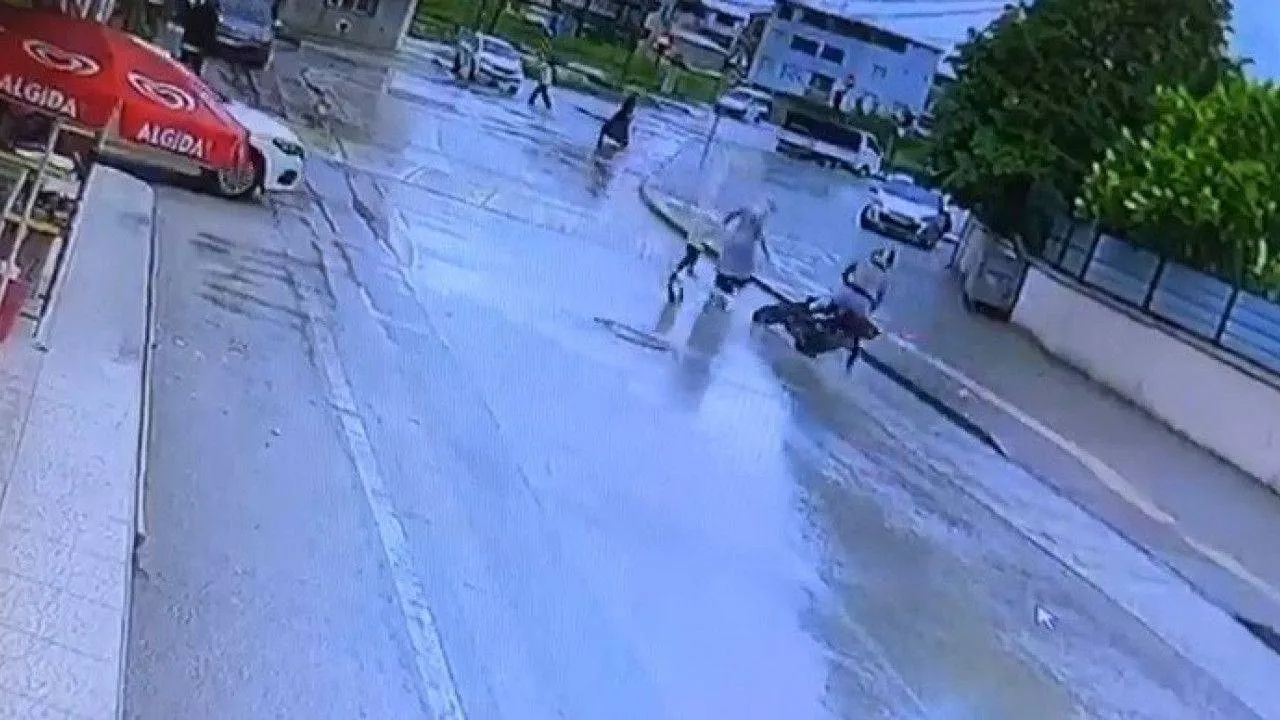 Bursa’da seyir halindeki motosiklet sürücüsü yağışlı havanın etkisiyle duramayarak, yolun karşısına geçen anne ve küçük çocuğuna çarptı. Yürekleri ağza getiren kaza görüntüsü bir işyerinin güvenlik kamerasına saniye saniye yansıdı.