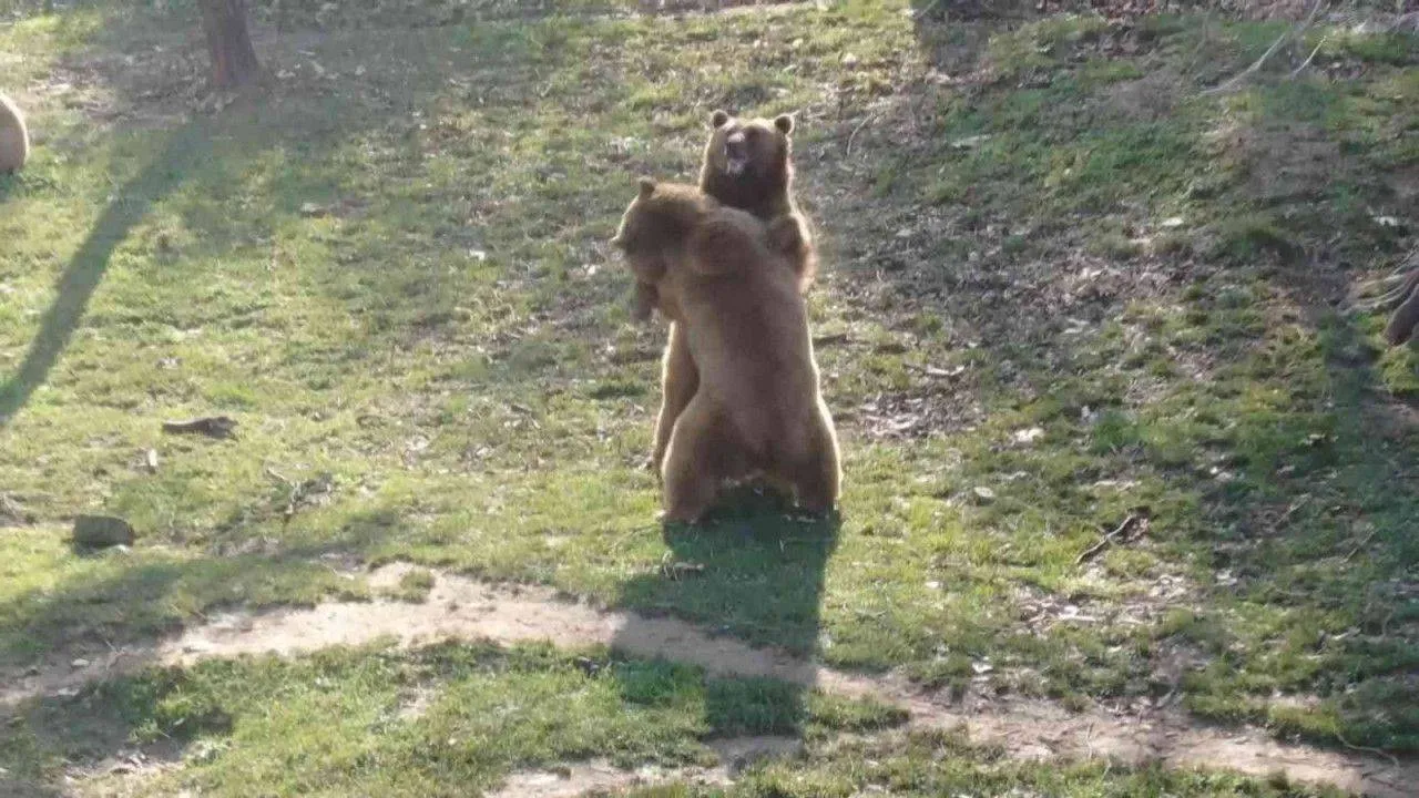Bakıcıları tarafından iyi bakılmasıyla keyifleri yerinde olan ayılardan kimi ağaç altında şekerleme yaparken, kimi ise kendi dengi ile güreşe tutundu. Dron ile kayda alınan o anlar, renkli görüntülere sahne oldu. Ayıların birbirlerine zarar vermeden yaptıkları güneş, birisinin pes etmesiyle son buldu.