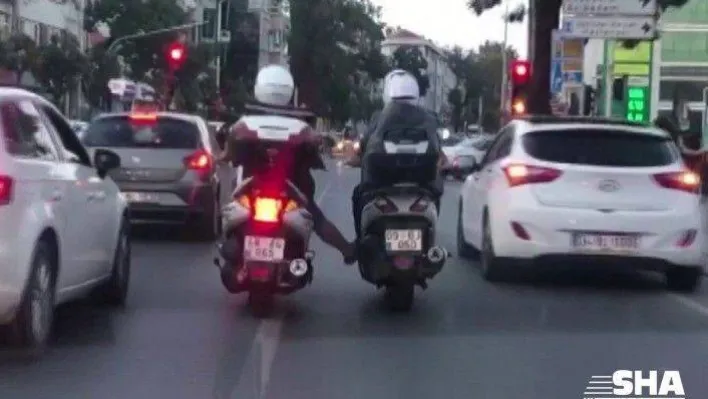 Motosikletli kurye, yanında giden bir başka motosikletli kuryenin motoruna ayağı ile basıp seyir etmesi yürekleri ağızlara getirdi.