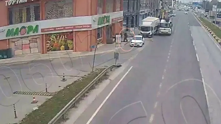 Sakarya'da iş makinesi yüklü tırın yol kenarında park halindeki kamyona çarptığı ve bu esnada kaldırımdaki vatandaşın ölümden döndüğü anlar kameralara yansıdı.