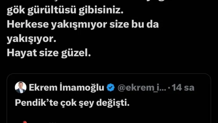 İBB Başkanı Ekrem İmamoğlu'nun sosyal medya hesabı üzerinden Pendik'te yaptıkları ile ilgili paylaşımına Pendik Belediye Başkanı Cin'den manidar cevap geldi. Cin, 'Tarlada izi olmayanın harmanda yüzü olmaz derler. Sizin için geçerli değil herhalde. 4 yılda Pendik'te bir iziniz olmadığı halde Maşaallah Twitter'da yağmursuz gök gürültüsü gibisiniz' dedi.