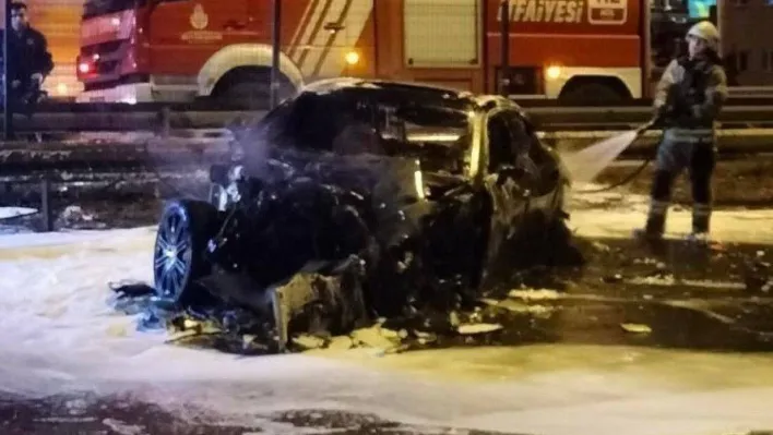 Pendik'te TIR'ın çarptığı otomobil bariyerlere girerek alev aldı. Aracın yandığı anlar bir vatandaşın cep telefonu kamerasına yansırken, alevlere teslim olan otomobil yanarak küle döndü.