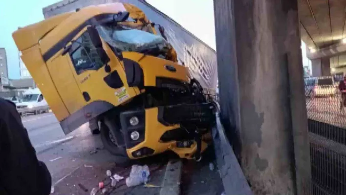 Pendik'te E-5 Karayolu'nda şoförünün direksiyon hakimiyetini kaybettiği tır üst geçide çarptı. Araç içerisinde sıkışarak yaralanan şoför sıkıştığı yerden kurtarılırken, bölgede trafik yoğunluğu oluştu.