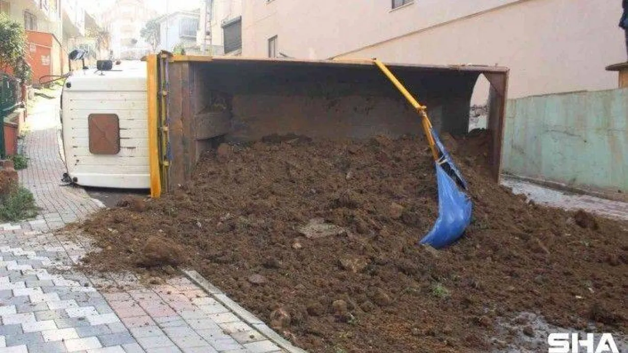 Pendik’te freni boşalarak yokuş aşağı kayan toprak yüklü hafriyat kamyonu, duvara çarpıp devrildi. Kazada tonlarca toprak, kamyon kasasından yola döküldü.