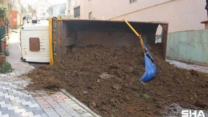 Pendik'te freni boşalarak yokuş aşağı kayan toprak yüklü hafriyat kamyonu, duvara çarpıp devrildi. Kazada tonlarca toprak, kamyon kasasından yola döküldü.
