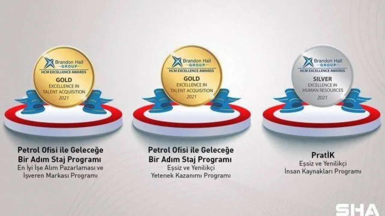 Petrol Ofisi, yapılan değerlendirmede Brandon Hall Group HCM Mükemmellik Ödülleri 2021’de, iki farklı programı ile 3 ödül birden aldı. Şirketin ‘Petrol Ofisi ile Geleceğe Bir Adım’ online staj programı ‘Eşsiz ve Yenilikçi Yetenek Kazanımı Programı’ ve ‘En İyi İşe Alım Pazarlaması ve İşveren Markası Programı’ kategorilerinde Altın Ödül’e layık görüldü. Şirketin, Tüm İK süreçlerini online’a taşıdığı ‘İK İş Akışı Yönetim Sistemi: PratİK’de, ‘Eşsiz ve Yenilikçi İK Programı’ kategorisinde Gümüş Ödül aldı.