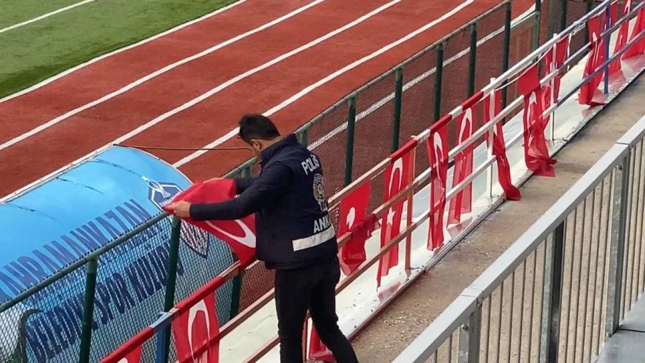 Ankara'da Kahramankazan Belediyespor-Keçiören Belediyesi Bağlumspor maçında rüzgardan dolayı katlanan bayrakları düzelten polis memurunun cep telefonu kamerasına yansıyan görüntüsü yürekleri ısıttı.