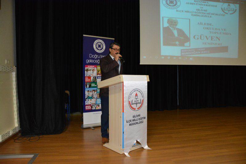 Okul ve kurum idarecilerine ve rehber öğretmenlerine yönelik Aydın Üniversitesi ile iş birliği çerçevesinde düzenlenmiş olan "Ailede, Okulda ve Toplumda Güven " konulu seminer, Sosyolog Yazar Nurdoğan Arkış tarafından, Ertuğrul Gazi Ortaokulu salonunda gerçekleştirildi. Seminerlere İlçe Milli Eğitim Müdürü Ahmet Ay ve Şube Müdürleri Sayın Osman Kesici ve Sayın Erdal Aslan da katıldı. Program sonunda İlçe Milli Eğitim Müdürü Ahmet Ay konuşmacı Nurdoğan Arkış’a çiçek takdim etti.