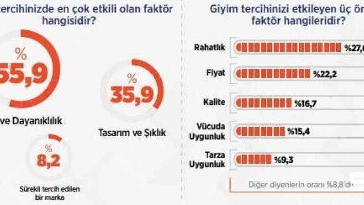 Giyim tercihinizi etkileyen 3 önemli faktörün de sorulduğu araştırmaya göre, vatandaşların yüzde 27.6’sı rahatlık cevabı verdi. Rahatlık cevabını, yüzde 22.2 ile fiyat, yüzde 16.7 ile kalite, yüzde 15.4 vücuda uygunluk ve yüzde 9.3 ile tarza uygunluk yanıtları takip etti. Giyim tarzını etkileyen faktörler arasında ‘marka yanıtı verenlerin oranı yüzde 4, tasarım ise 1.7 olurken, işlevsellik diyenlerin oranı yüzde 1.2’de kaldı. Katılımcıların yüzde 1’i, giyim tercihlerinde reklamın önemli olduğunu ifade etti.