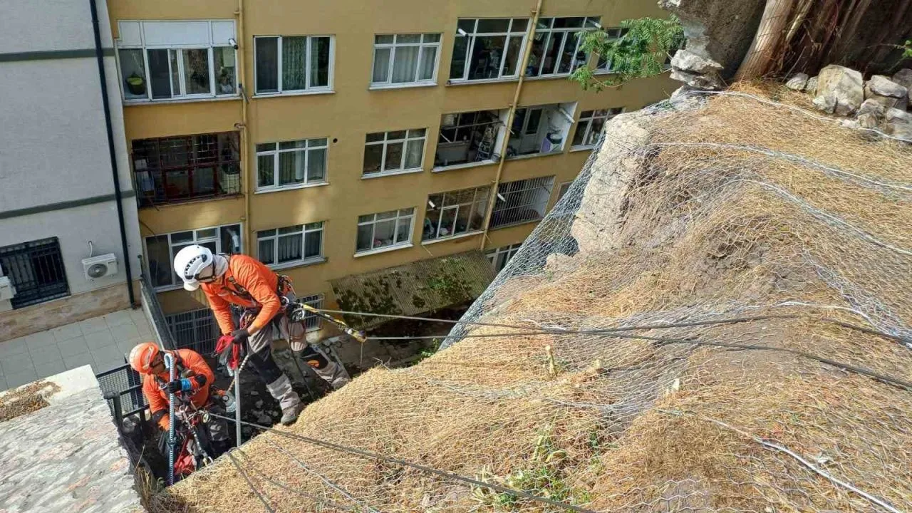 Yüksekten kayabilecek kaya parçalarının çevreye zarar vermesi önlenirken, eğimli arazinin üst kısmına güvenlik amacıyla korkuluk yerleştirildi. Kocaeli Büyükşehir Belediyesi’nin bu müdahalesi, bölgedeki yapıların güvenliğini sağlamakla kalmayıp, olası afet risklerini de en aza indirdi.