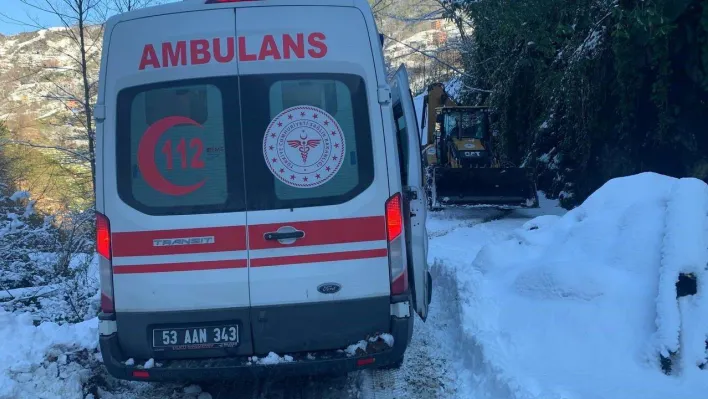Rize'nin Pazar ilçesinde köyde yaşayan tansiyon hastası vatandaşı hastaneye götürmek için giden ambulans kardan ötürü çıkamayınca ekipler kepçeyle yolu açtı.