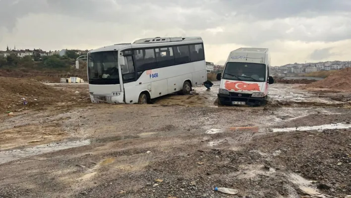 Kocaeli'nin Darıca ilçesinde etkili olan yağmur sonrası yolda çökme meydana geldi, 2 servis aracı çukura girerek hasar aldı.