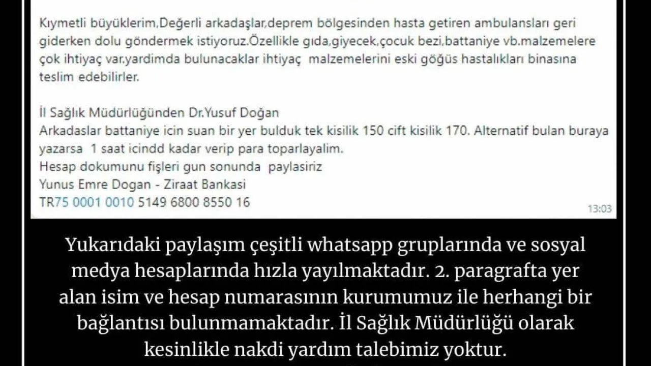 Açıklamada, Whatsapp ve sosyal medya gruplarında "İl sağlık müdürlüğünden paylaşılan teyitli mesajdır. Kıymetli büyüklerim, değerli arkadaşlar, deprem bölgesinden hasta getiren ambulansları geri giderken dolu göndermek istiyoruz. Özellikle gıda, giyecek, çocuk bezi, battaniye gibi malzemelere çok ihtiyaç var. Yardımda bulunacaklar ihtiyaç malzemelerini eski göğüs hastalıkları binasına teslim edebilirler. İl Sağlık Müdürlüğünden Dr. Yusuf Doğan. Arkadaşlar battaniye için şuan bir yer bulduk. Tek kişilik 150, çift kişilik 170. Alternatif bulan buraya yazarsa 1 saat içinde kaıar verip para toparlayalım. Hesap dökümünü, fişleri gün sonunda paylaşırız. Yunus Emre Doğan - Ziraat Bankası- TR75 0001 0010 5149 6800 8550 16" mesajının paylaşıldığı hatırlatılarak, bunun kurumla ilgili olmadığı belirtildi. Vatandaşlara uyarılarda bulunulan açıklama şu şekilde: