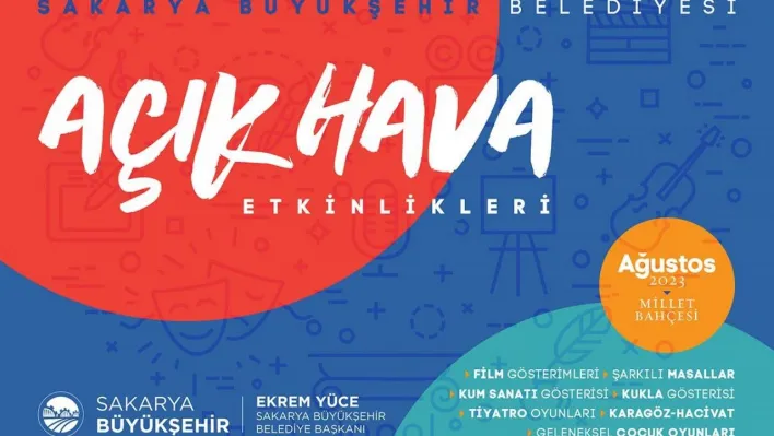 Sakarya Büyükşehir Belediyesi açık hava etkinlikleri başlıyor. Sinema, tiyatro, çocuk etkinlikleri ve gösterilerle vatandaşlara kapılarını açacak olan Millet Bahçesi Ağustos ayında kültür sanat etkinliklerinin merkezi olacak. Müzisyen Yücel Arzen, Necip Fazıl Kısakürek'i anma programında Sakaryalı kültür sanat dostlarıyla buluşacak.