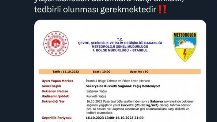 Sakarya Valiliği, meteorolojik verilere göre 16 Ekim Pazartesi günü öğle saatlerinden itibaren beklenen kuvvetli sağanak yağışa karşı uyardı. Valiliğin sosyal medya hesabından yapılan paylaşımda, “16.10.2023 Pazartesi öğle saatlerinden sonra Sakarya çevrelerinde beklenen sağanak yağışların yerel kuvvetli (21-50 kg /m2) olacağı tahmin ediliyor. Sel, su baskını ve ulaşımda aksamalar gibi olumsuzluklara karşı dikkatli ve tedbirli olunmalıdır” denildi.
