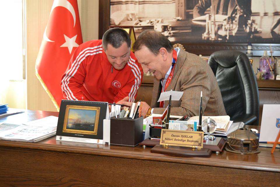 İlçemizin uluslararası bir markası haline gelen, Lizbon'da düzenlenen Down Sendromlular Atletizm Şampiyonası'nda 15 ülke arasından cirit atmada Avrupa İkincisi, disk atmada da Avrupa Üçüncüsü olan ve geçtiğimiz hafta da Antalya'da düzenlenen Türkiye Şampiyonası'nda, Hasan Hüseyin Akkar ile birlikte 3 Altın Madalya'yı bizlere getiren Şampiyon Volkan Yavuzaslan, hocaları Yavuz Ergen, Mesut Özdoğan ve İlçe Milli Eğitim Şube Müdürü Can Dağaşan ile birlikte Belediye Başkanı Özcan Işıklar'ı makamında ziyaret ettiler.