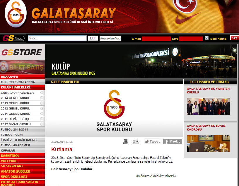 Sarı kırmızılılar, ezeli rakepleri Fenerbahçe'nin şampiyonluğunu jet hızıyla kutladı.Galatasaray'ın resmi internet sitesinden yayınlanan mesajda "2013-2014 Spor Toto Süper Lig Şampiyonluğu'nu kazanan Fenerbahçe Futbol Takımı'nı kutluyor, ezeli rakibimiz, ebedi dostumuz Fenerbahçe camiasına sevgilerimizi yolluyoruz." denildi.