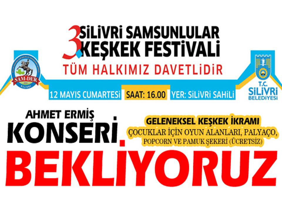 Silivri Samsunlular Derneği’nin bu yıl 3’üncüsünü yapacağı Keşkek Festivali büyük sürprizlerle geliyor. Ahmet Ermiş’in dev orkestra ile konser vereceği festivalde vatandaşlara keşkek ikramı yapılacak. Ayrıca oyun alanı, palyaço ve yüz boyama ile festival renklendirilecek.