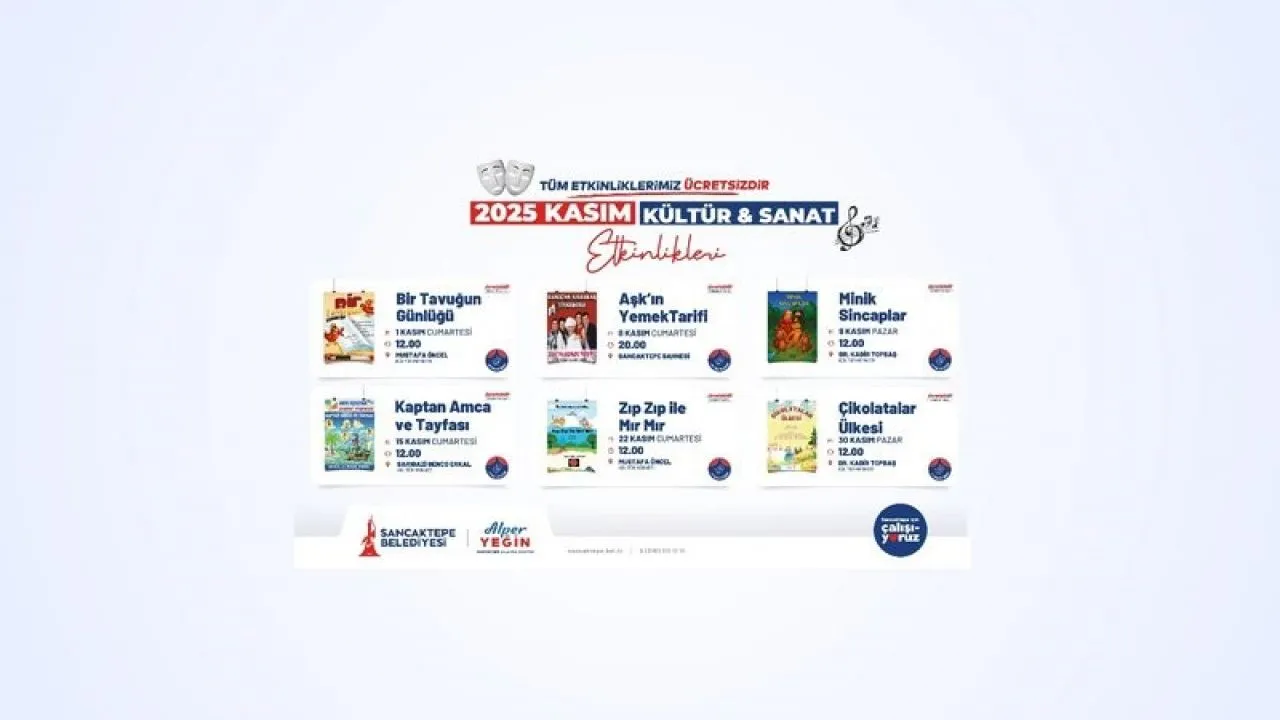 Etkinlikler kapsamında; "Aşk’ın Yemek Tarifi" - 8 Kasım Cumartesi, 20.00 / Emek Kültür Merkezi, "Kaptan Amca ve Tayfası" - 9 Kasım Pazar, 12.00 / Mevlana Kültür Merkezi, "Minik Sincaplar" - 16 Kasım Pazar, 12.00 / Yenidoğan Kültür Merkezi, "Zıp Zıp ile Mır Mır" - 22 Kasım Cumartesi, 12.00 / Yenidoğan Kültür Merkezi, "Çikolatalar Ülkesi" - 23 Kasım Pazar, 12.00 / Samandıra Kültür Merkezi’nde ücretsiz olarak sahnelenecek.