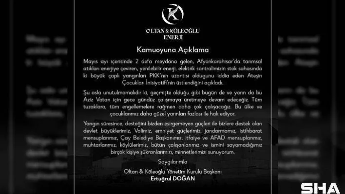 “Mayıs ayı içerisinde iki defa meydana gelen Afyonkarahisar’da tarımsal atıkları enerjiye çeviren yenilebilir enerji elektrik santralimizin stok sahasındaki büyük çaplı yangınlarını PKK’nın uzantısı olduğunu iddia eden Ateşin Çocukları inisiyatifi üstlendiğini açıkladı. Şu asla unutulamamalıdır ki geçmişte olduğu gibi bu günde ve yarında bu aziz vatan için gece gündüz çalışmaya, üretmeye devam edeceğiz. Tüm tuzaklara, engellemelere rağmen daha çok çalışacağız. Bu ülke ve çocuklarımız daha güzel yarınları fazlası ile hak ediyor. Yangın süresince desteğini bizden esirgemeyen güçleri ile bizlere destek olan devlet büyüklerimiz, Valimiz, emniyet güçlerimiz, jandarmamız, istihbarat mensuplarımız, belediye başkanımız, itfaiye ve AFAD mensuplarımız, muhtarlarımız, köylülerimiz bütün çalışanlarımız ve ismini sayamadığımız bir çok kişiye şükranlarımızı sunarız.”