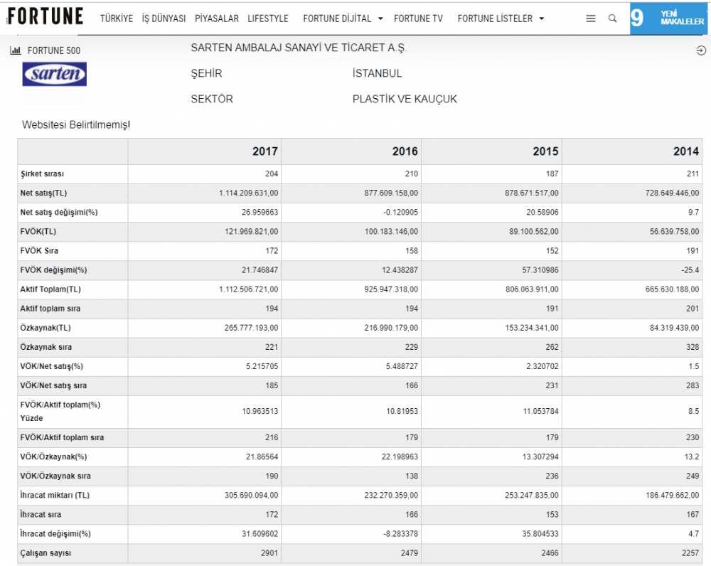 Türkiye'nin en büyük 500 şirketinin belirlendiği Fortune 500'de, 1.114.209.631 milyar liralık net satış geliriyle bu yıl 204.sırada yer aldı. Sarten, geçen yıl 877.609.158 net satış rakamlarıyla listede 210.cu sırada yer almıştı.