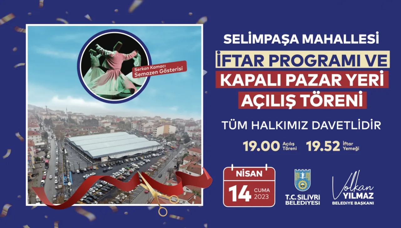 Selimpaşa Kapalı Pazar Yeri ve Etkinlik Alanı açılışının hemen ardından alanda kurulan gönül sofrasında iftar yemeği programı düzenlenecek. Serkan Kamacı Sufi Meşk Topluluğu iftar programında Semazen Gösterisi yapacak.